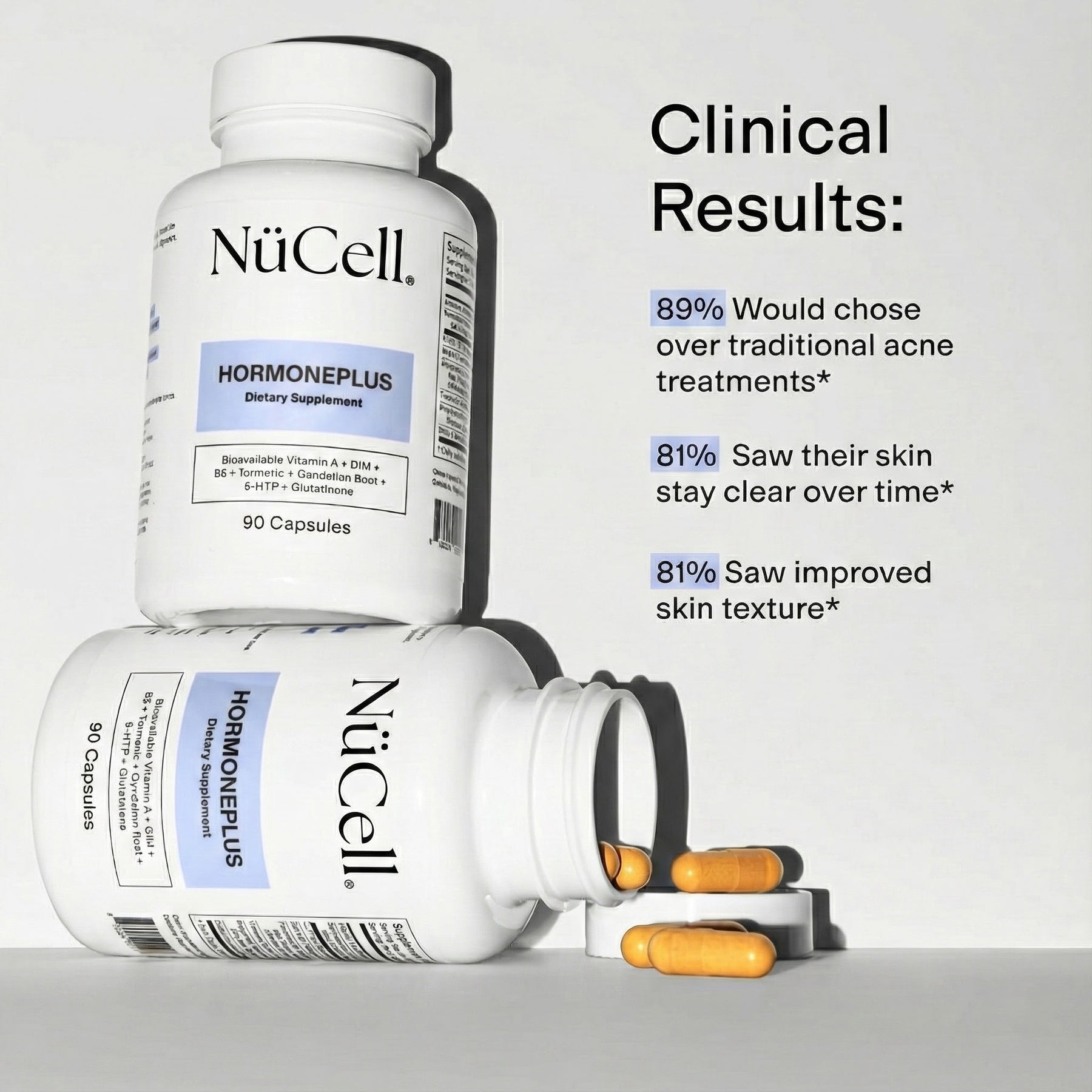 NüCell Acne Supplement is a clinical-strength, acne-safe supplement designed to rebalance what’s happening inside so your skin can finally calm, clear, and glow. With bioavailable nutrients and powerful botanicals, it targets the most common internal root causes of breakouts—hormones, stress, inflammation, and sluggish detox pathways. Just a few capsules a day help restore clarity, confidence, and long-term skin health.