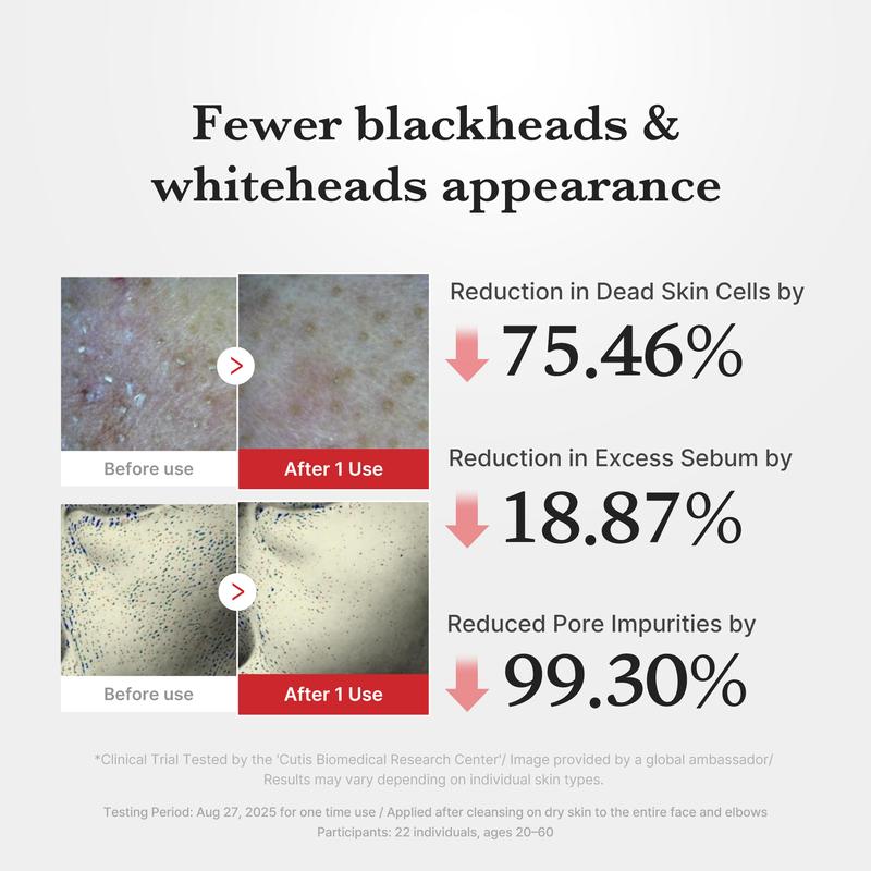 Clinical testing showed visible improvement after a single use, including a reduction in dead skin cells and pore impurities. Continued daily use enhances clarity, smoothness, and overall skin radiance.